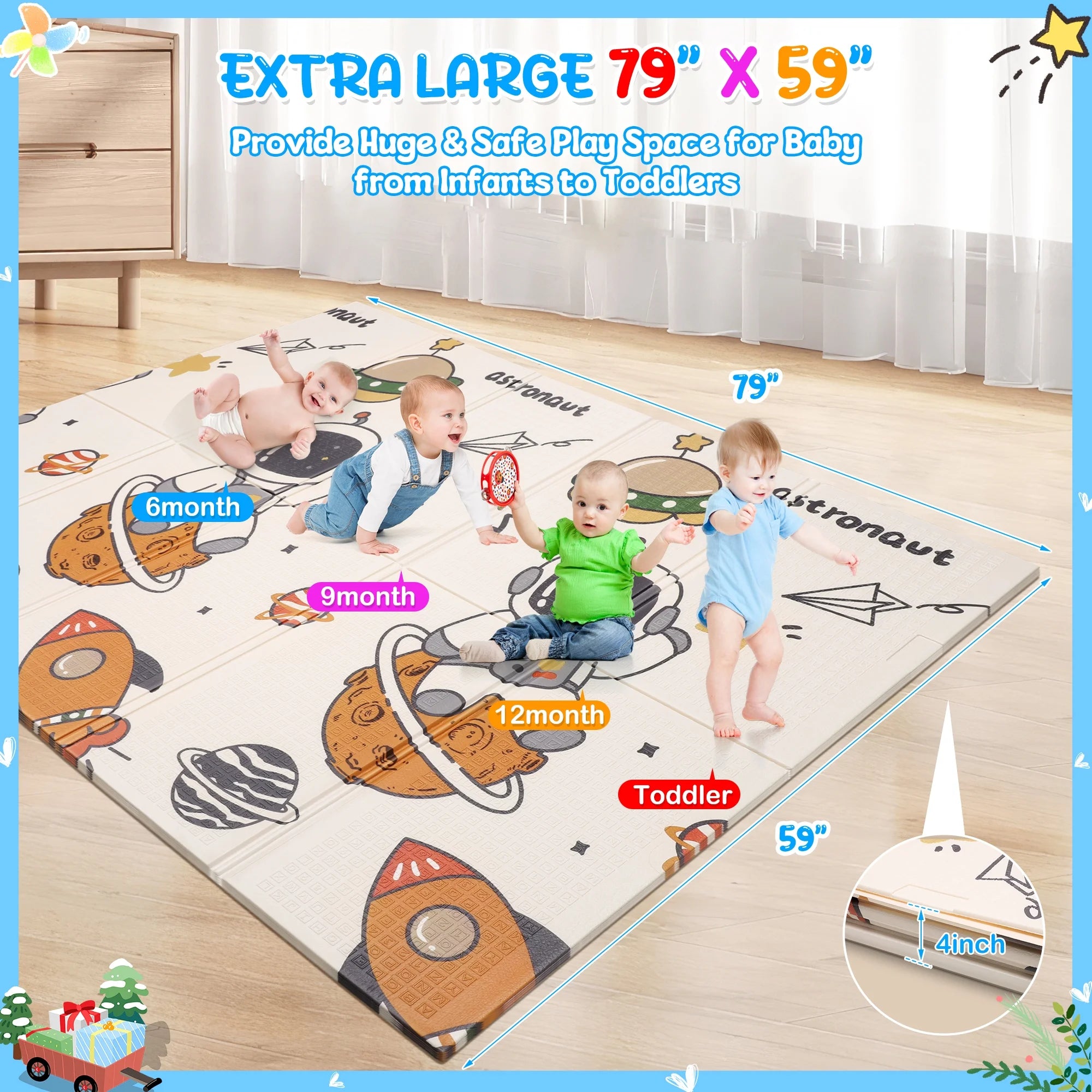 Enjoy peace of mind with RELOIVE's 79"x59" extra-large foldable play mat, offering ample room for your child's adventures. Perfectly designed for tummy time, crawling, and the first steps, its generous size ensures a safe and engaging area for play. Engineered to fit seamlessly inside playpens, this mat provides a thick, cushioned surface to protect your little one from falls, making every playtime a joy.
