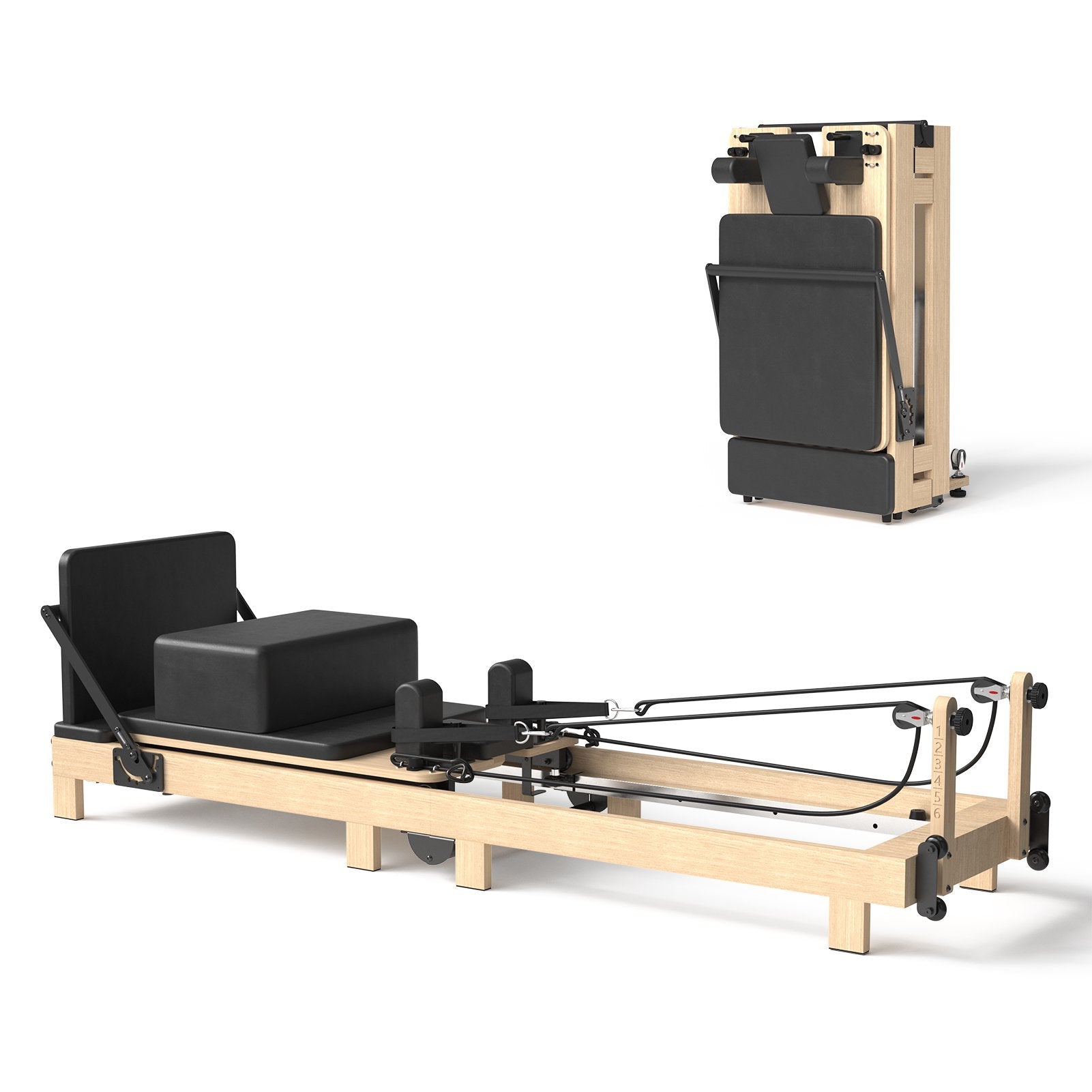 【Foldable frame and built-in wheels】For homes or studios with limited space, this pilates reformer stands out as the first foldable wood reformer on the market. This compact design can be placed in any corner of your home to save space. built-in wheels make it easy to move reformer around.