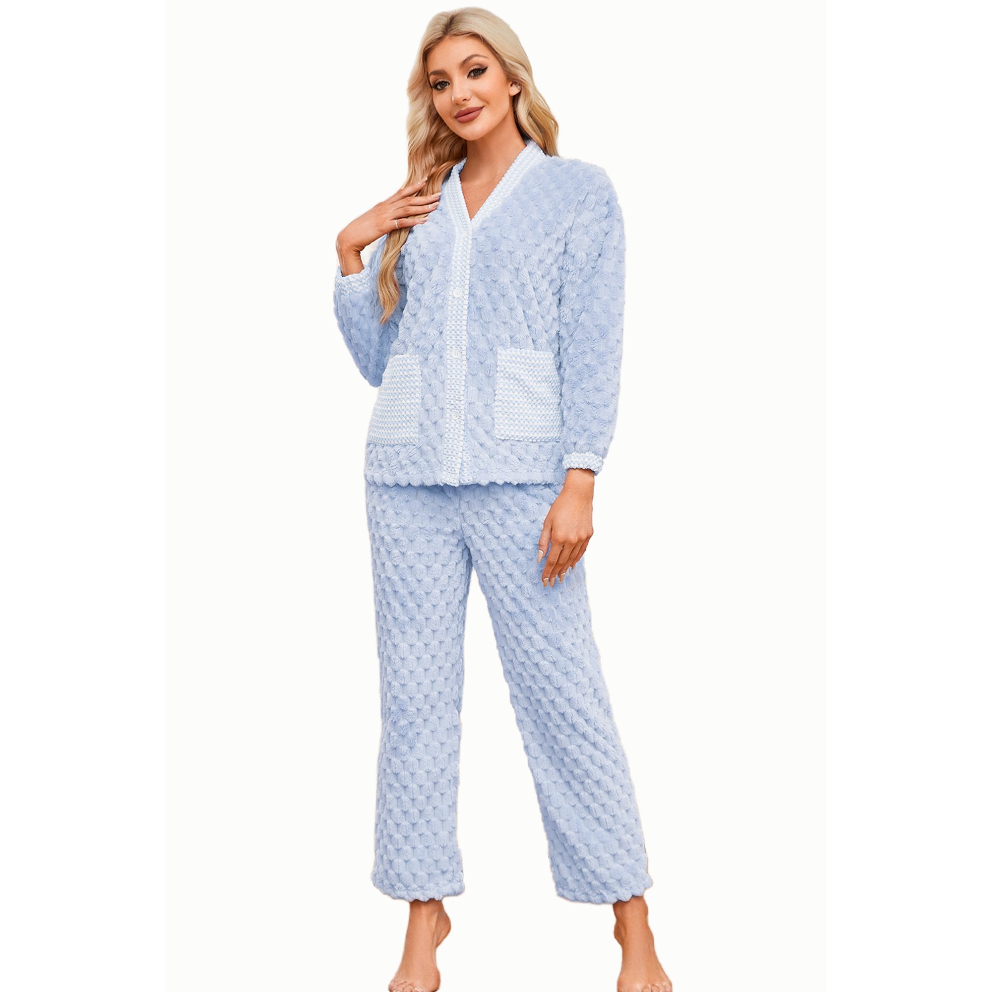 - Practical Pockets: Fuzzy pjs for women includes two large front pockets on the top and functional side seam pockets on the pants. These are perfect for keeping your phone, keys, and earphones handy, making this set both stylish and practical for everyday use.